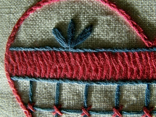 Vid andra träffen visar vi hallandssöm i litteraturen och pratar lite kring olika varianter. Vi fortsätter att brodera. Sömsätten är stjälkstygn, kedjestygn, korsstygn, flätsöm, langettstygn, ensidig och dubbelsidig plattsöm och de olika bottensömmarna..
