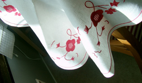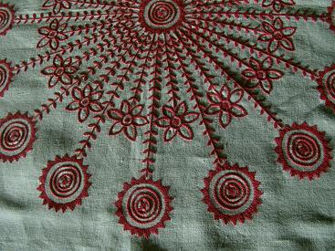 Blommans blad är broderade med flätsöm – detalj ur Krogseredsduken. |